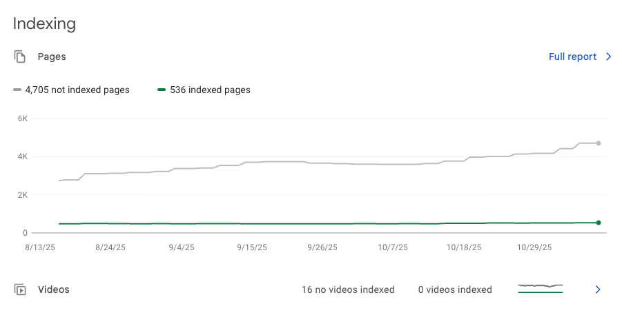 The Coverage page provides a snapshot of your site’s indexing status, highlighting: