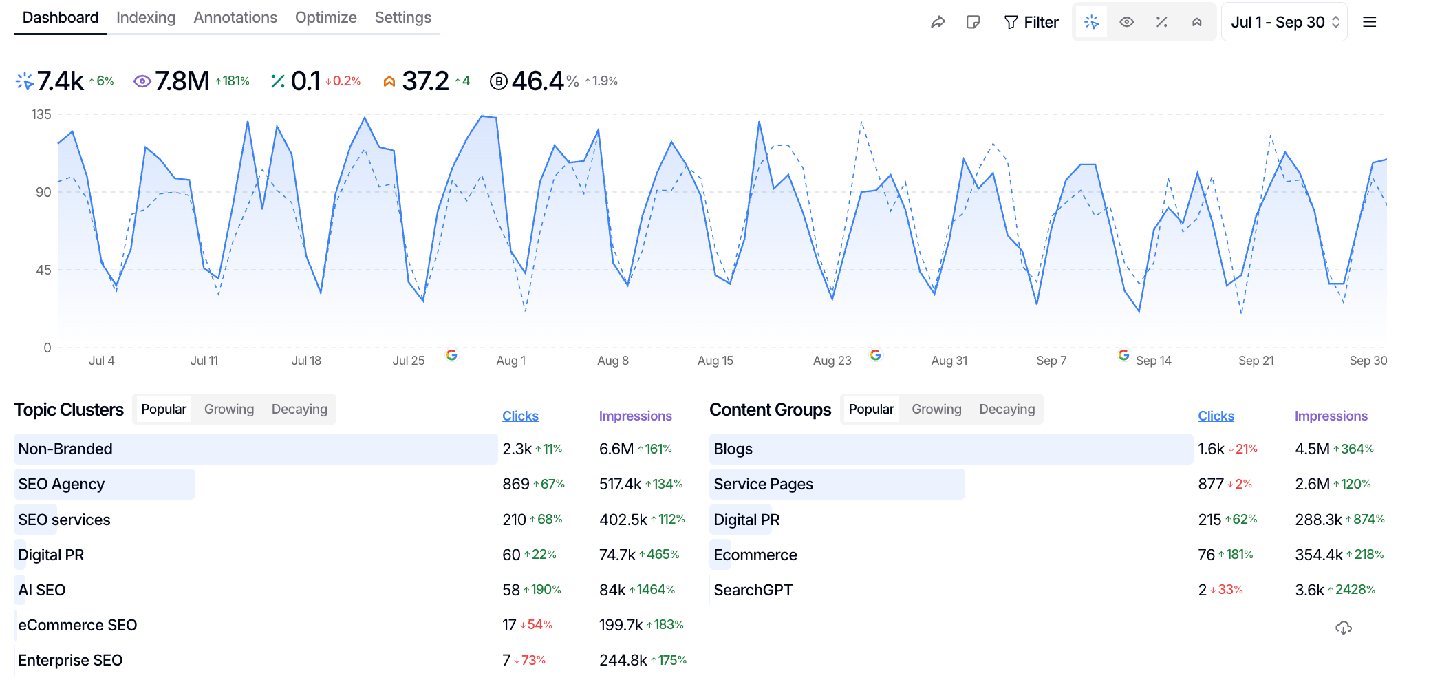 - Measurement: Track clicks, impressions, and ranking changes over time. Connect to Google Analytics for deeper user data.