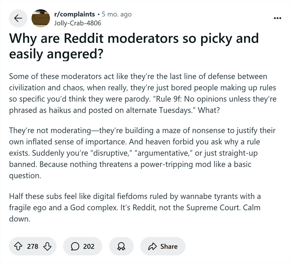 Side note: Even if you play by the rules, downvotes happen. Bots filter posts. Mods nuke comments for reasons you’ll never know. That’s just Reddit being Reddit. Let it go and move on. You’ve only got three hours a week to spend here.