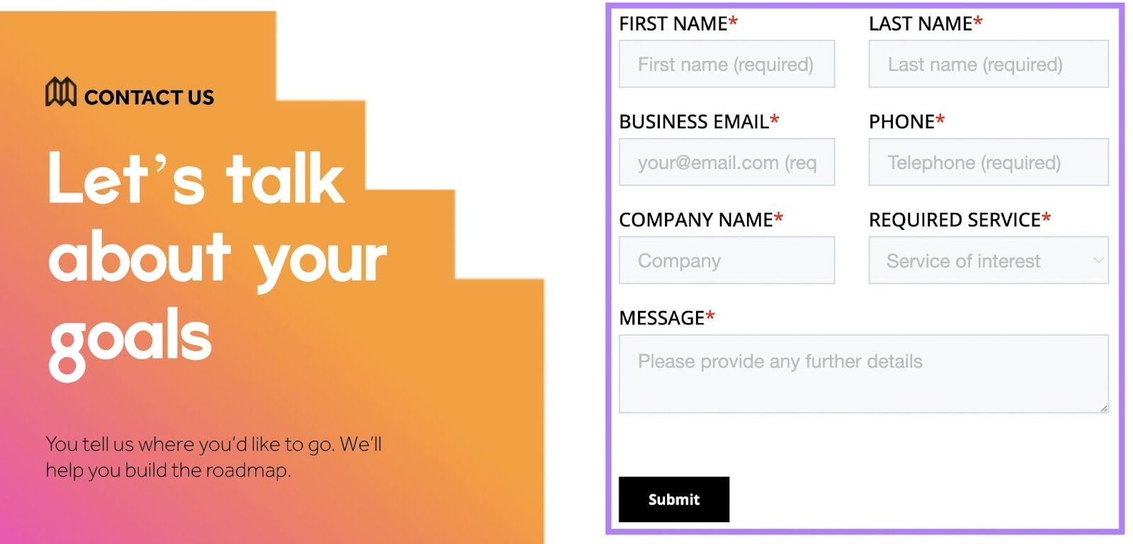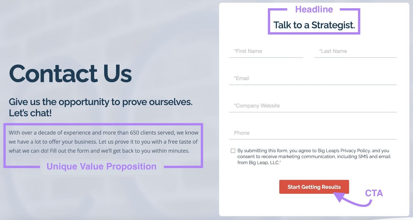 For instance, Big Leap’s contact page effectively uses a submission form, clear calls to action (CTAs), and a compelling unique value proposition (UVP) to boost conversions.