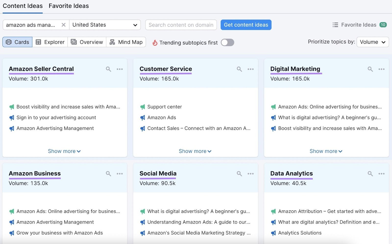 Simply enter a relevant topic related to your marketing services, choose your target location, and click “Get content ideas” to discover popular and relevant content topics.