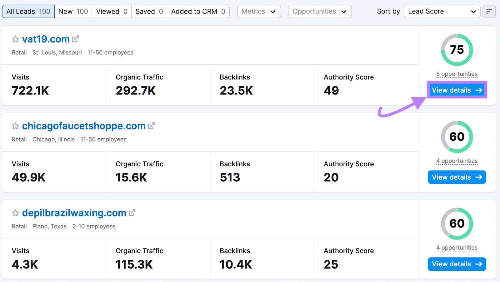 In the report, you’ll find a list of websites along with their “Lead Scores.”