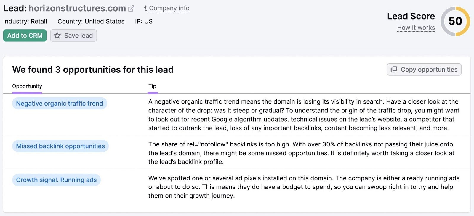 For example, this prospect shows three opportunities that an agency could support the prospect with. One related to advertising, one related to backlinks, and one related to organic traffic.