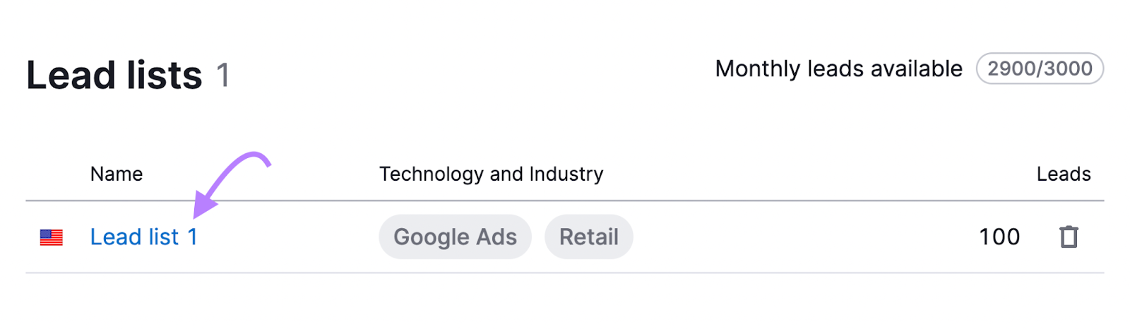 When your list is ready, it will populate in the “Lead lists” table farther down on the page.