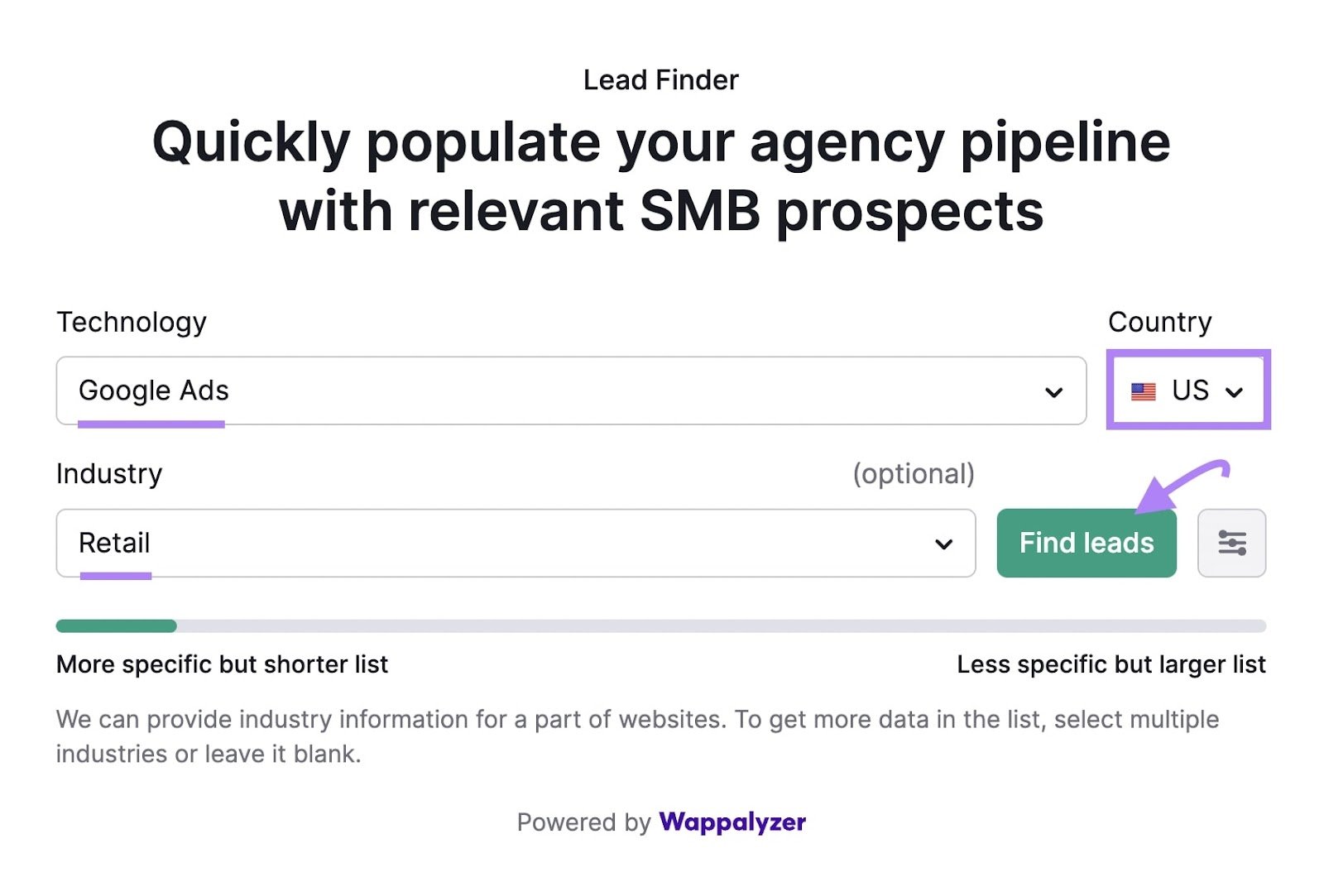 To get started, visit the tool and choose an option in the “Technology” field—select a technology commonly used in your niche or one that your agency specializes in.