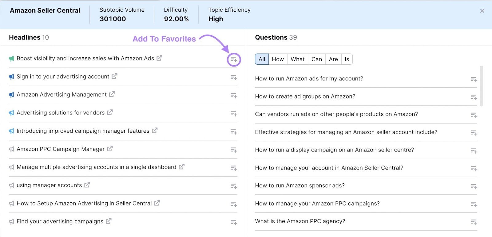 On the expanded card, you’ll see a list of headlines and questions related to the subtopic you can use as inspiration for your content creation.